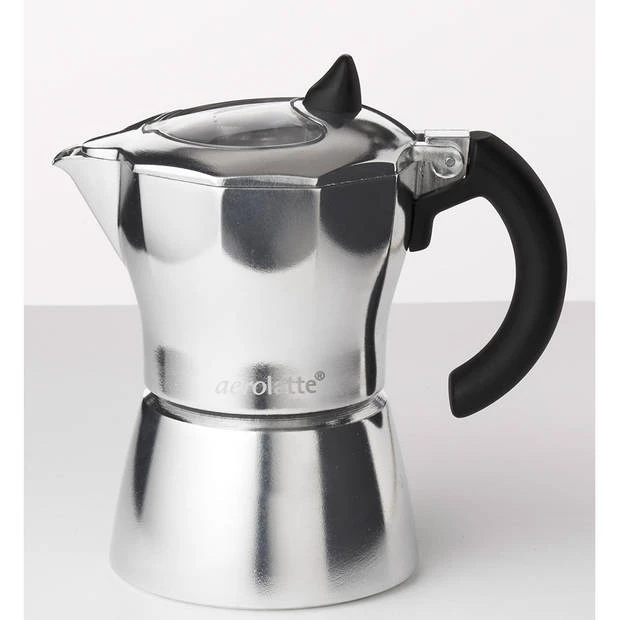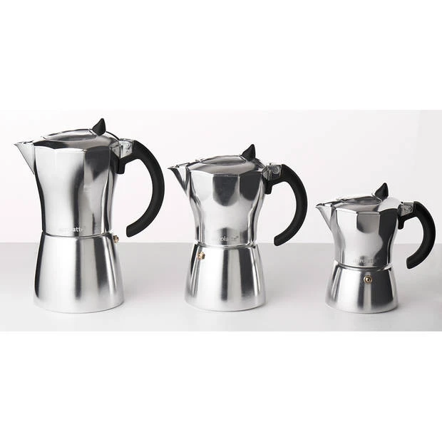 De espressomaker zet 3 kopjes espresso en is geschikt voor alle warmtebronnen behalve inductie. Tip: zet deze kleine kan op een vlamverdeler zodat het niet omvalt.