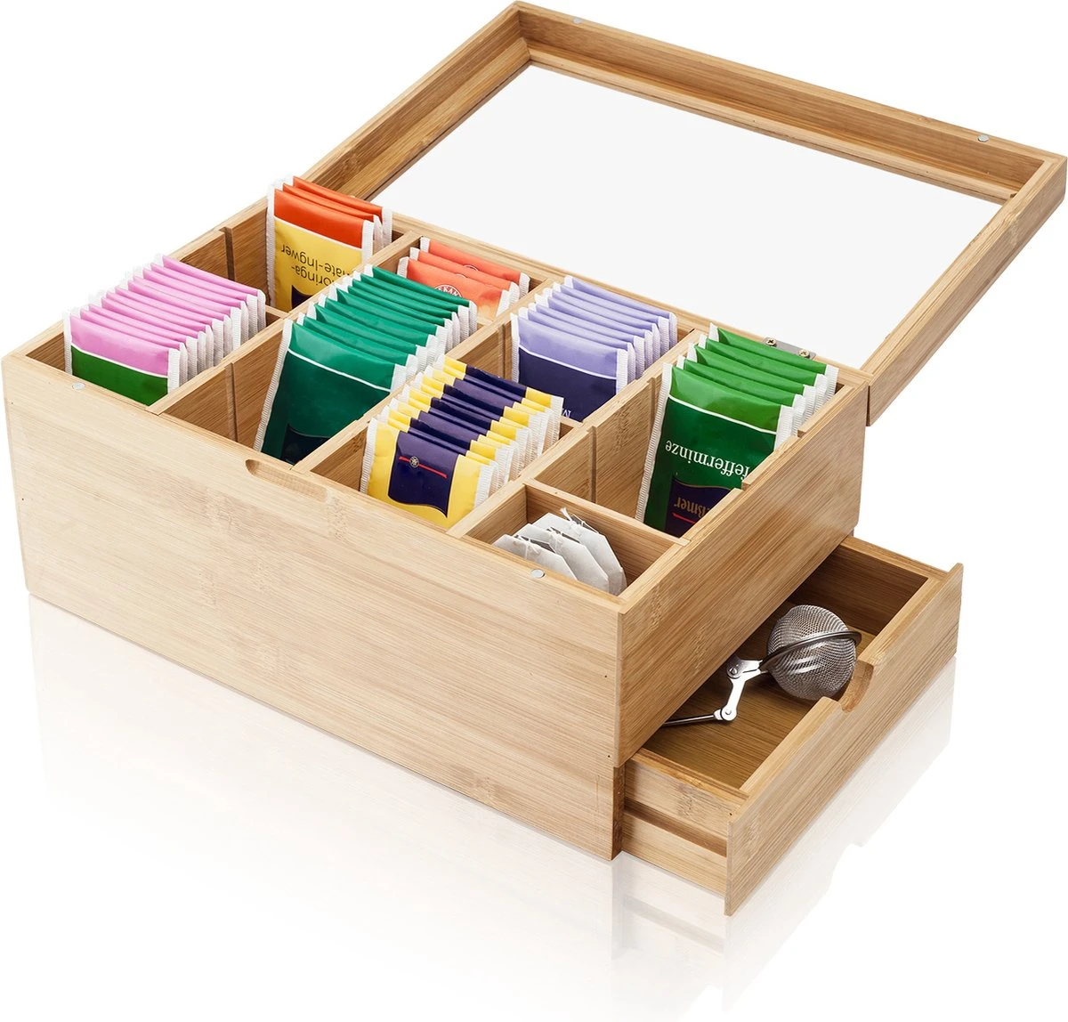 Amazy Theedoos Bamboe Extra Groot Met Lade En Theeplank – Thee Opslag Voor Theezakjes, Organizer Houten Doos Met Theekist, Theedozen Met 8 Verstelbare Verdelers, Opbergdoos