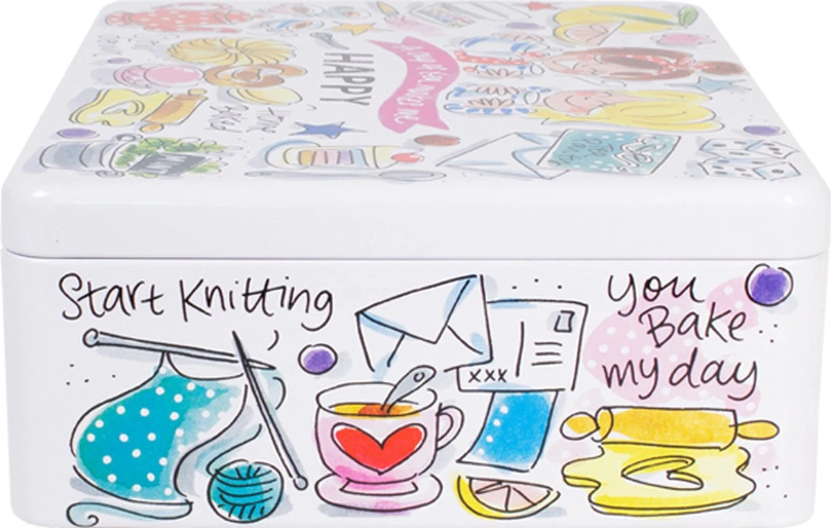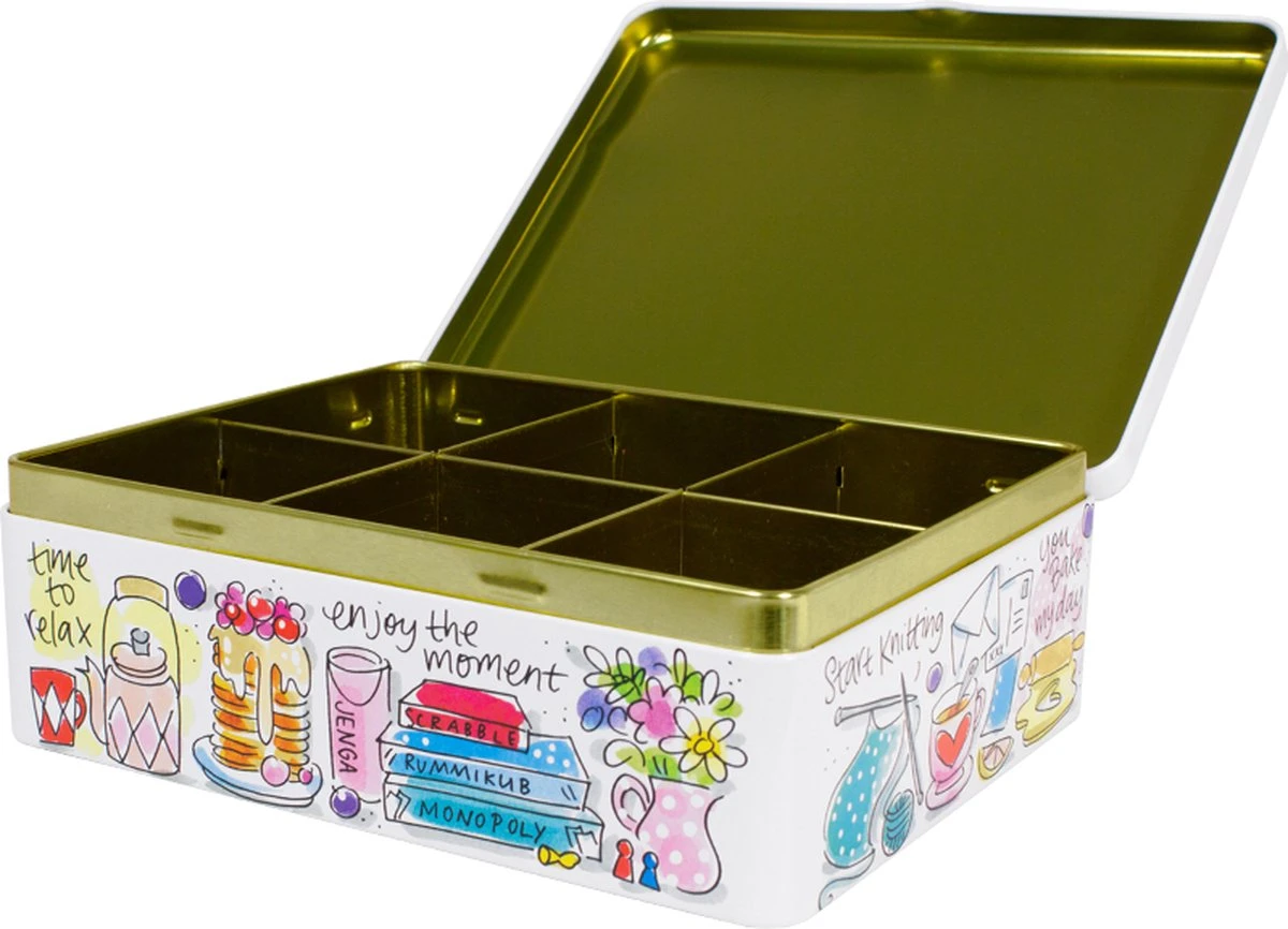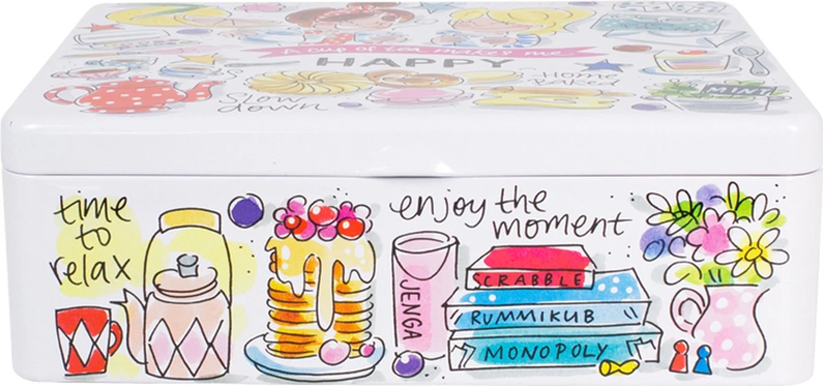 This make me happy! Dit vrolijke theeblik, maakt jouw tafel én thee momentje nog gezelliger! De opvallende en kleurrijke illustraties zijn in het thema Happy ontworpen. Op het theeblik staan allemaal grappige quotes die jou blij maken. Het theeblik is leuk te combineren met de andere nieuwe Happy items.