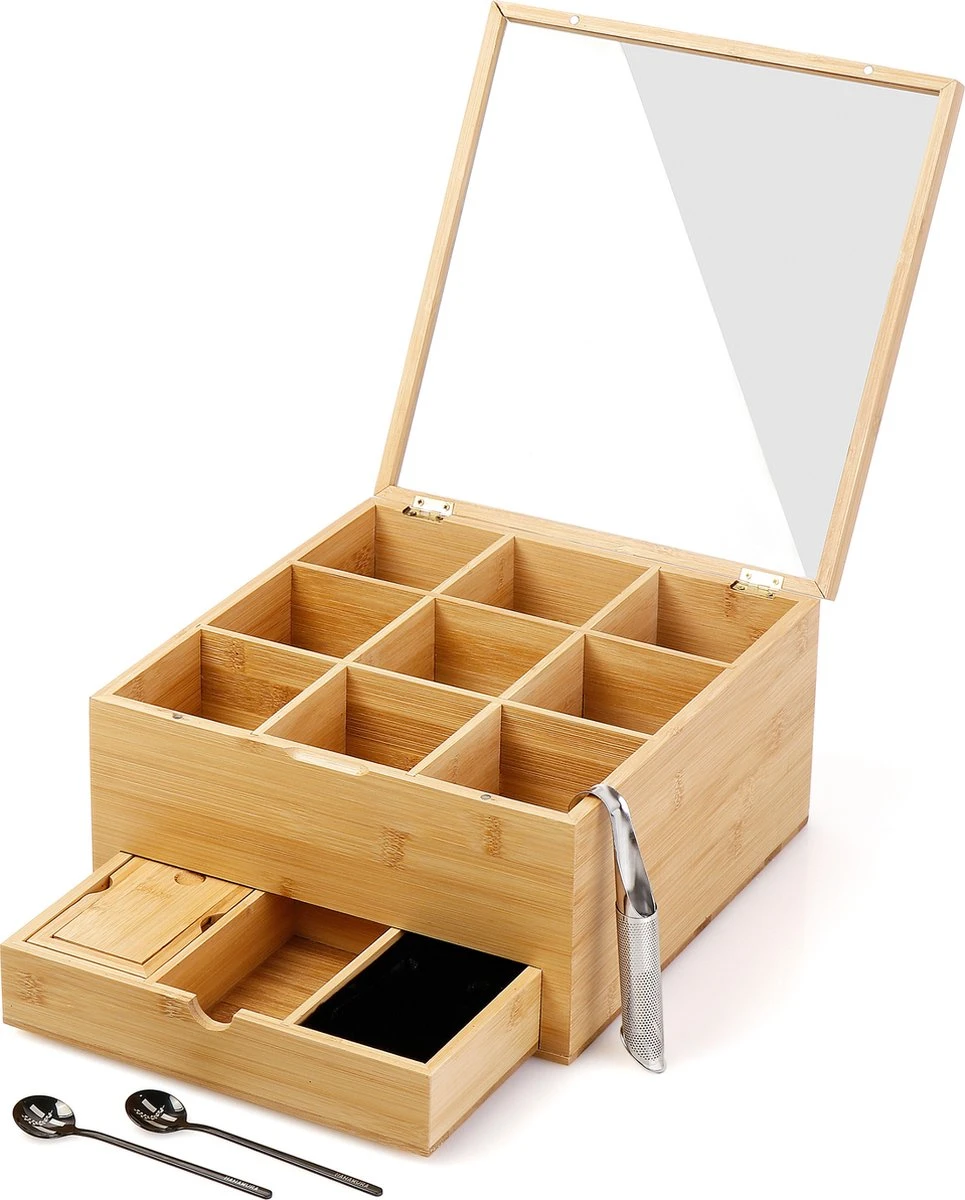 Bewaar en presenteer je favoriete theesmaken in deze luxe theedoos van Hanamura. De theedoos heeft aan de bovenkant 9 diepe vakken voor theezakjes en is gemaakt van duurzaam bamboe. De lade aan de onderzijde is voorzien van 5 vakken waarvan 3 bedoeld zijn voor losse thee. De overige 2 vakken kunnen gebruikt worden voor het bewaren van de gratis meegeleverde suikerdoos, 2 theelepels, en het thee-ei.