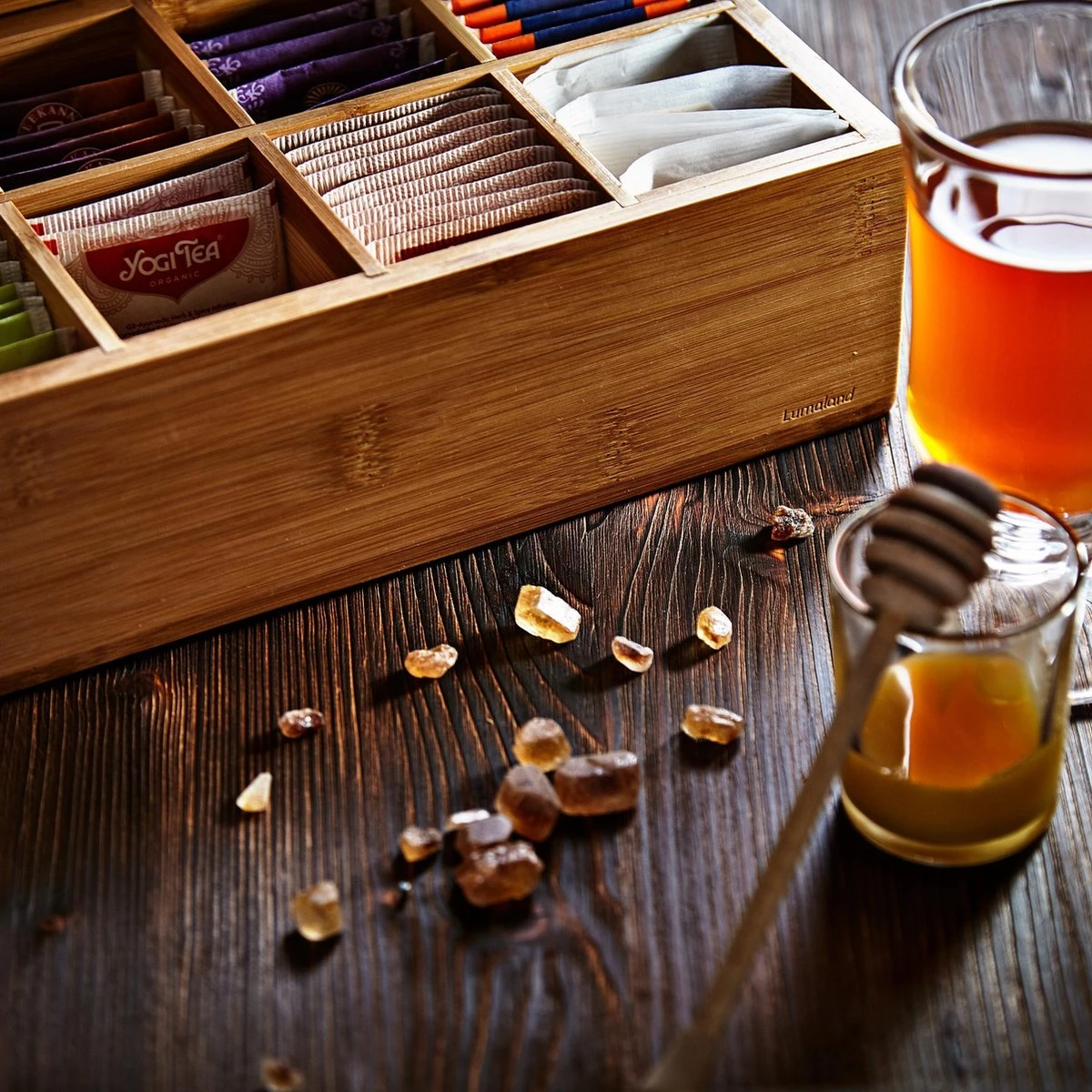De stijlvolle en decoratieve bamboe theedoos uit de Lumaland Cuisine is uitgerust met 8 vakken en geschikt voor alle gangbare theezakjes. Door het transparante venster is direct zichtbaar hoe vol de theebox is en of deze eventueel bijgevuld moet worden.