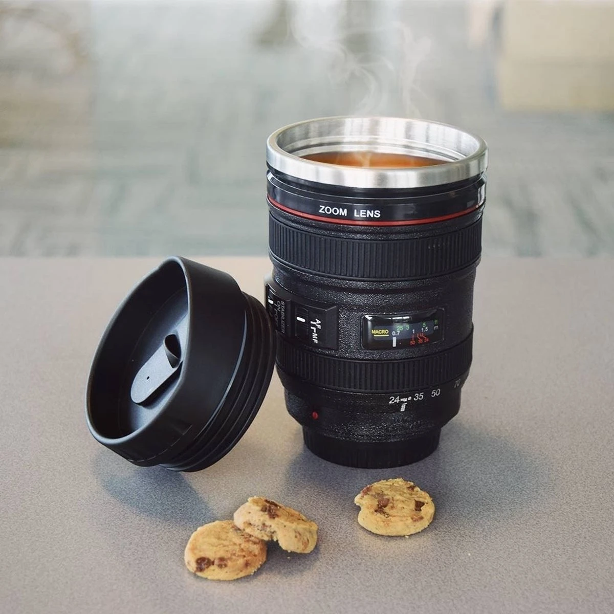 Uit deze thermosbeker van Out Of The Blue in de vorm van een telelens wil iedere fotograaf zijn koffie of thee drinken! De camera lens mok is voorzien van een schroefdop.