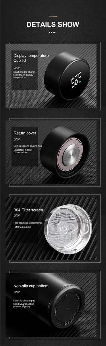 Deze 500ml slimme Thermosfles met temperatuur display is nieuw en trendy! Ons nieuwste TammaT Thermosfles heeft een stijlvol design en past perfect bij al je accessoires. Door de slimme temperatuur display, weet je altijd hoe heet en/of koud je drinken is, dat zorgt ervoor dat je nooit meer je mond of tong verbrand. Door roestvrij metaal en dubbelwandige vacuüm, maakt deze slimme rvs drinkfles robuust en duurzaam.